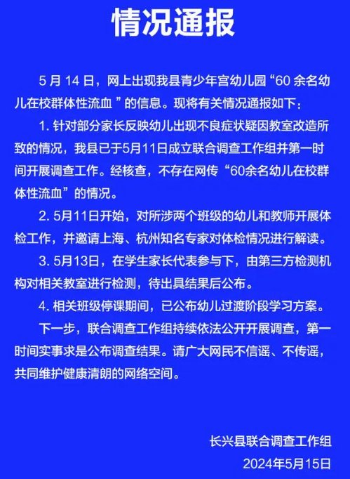 近日,网传浙江省湖州市长兴县青少年宫幼儿园“60余名幼儿在校群体性流血”,5月15日,当地联合调查工作组辟谣,该消息不实。