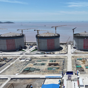 2024年5月15日,上海 LNG 站线扩建项目现场,项目接收站工程(一阶段)四个储罐已全部完成升顶,这标志着项目接收站工程储罐主体工程一个重要节点的完成。上海LNG站线扩建项目建成投产后,洋山LNG接收站液态存储能力将达到177.5万立方米,总储量翻一番,可以提供接近11亿方的储气能力和约428万方/小时的供气能力。