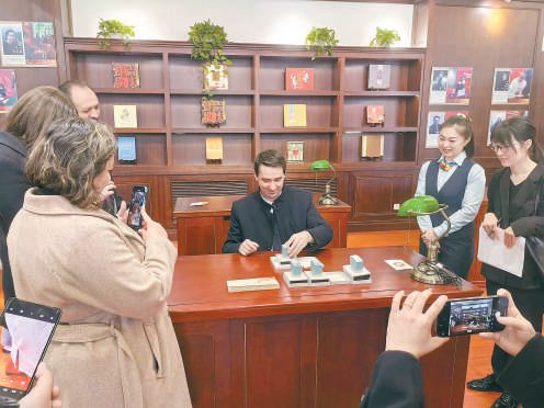在位于和平门的中国邮票设计师之家主题邮局内,来自罗马尼亚的参观者被2023年儿童节推出的九色鹿四色套色文化印章吸引,纷纷购买明信片后盖章留念。(中国邮票设计师之家主题邮局供图)
