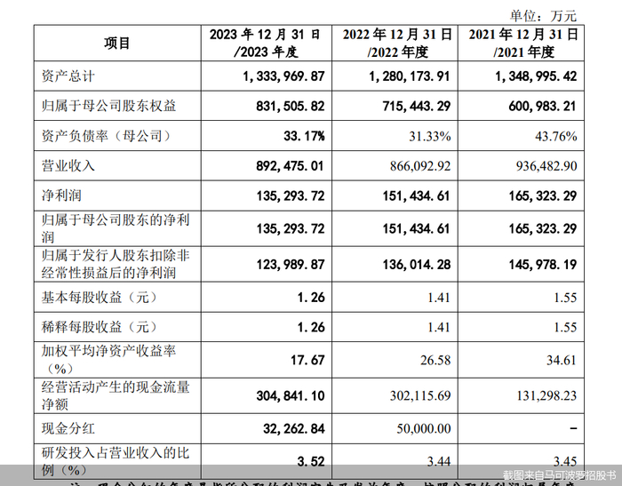 不过,IPO大考之际,马可波罗的业绩表现并不乐观。数据显示,2021-2023年,马可波罗实现营业收入分别约为93.65亿元、86.61亿元、89.25亿元;对应实现归属净利润分别约为16.53亿元、15.14亿元、13.53亿元;对应实现扣非后归属净利润分别约为14.6亿元、13.6亿元、12.4亿元。