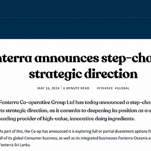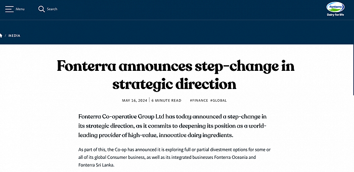 通报指出,恒天然今天宣布,为致力于巩固作为高价值创新乳制品原料全球领先供应商的地位,其战略方向发生重大变化。作为变化的一部分,公司正在探索全部或部分剥离其全球消费品业务,以及已整合了的恒天然大洋洲(Fonterra Oceania)业务、恒天然斯里兰卡(Fonterra Sri Lanka)业务的方案。