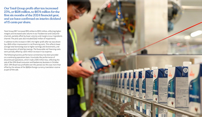 恒天然表示,总的来说,潜在剥离范围内的业务约占恒天然总乳固体的 15%,约占恒天然2024财年上半年营业利润的19%——其中,消费品业务带来了强劲的基础收益。