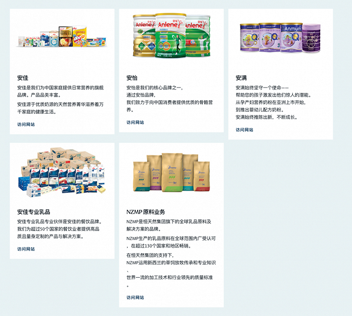 消费品及相关业务,包括了Anchor(安佳)、Mainland、Kāpiti、Anlene(安怡)、Anmum(安满)、Fernleaf、Western Star、Perfect Italiano等。