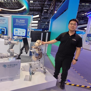 走过序厅,一款血管介入机器人映入眼帘。“这款机器人相当于医生的手,传统血管介入手术中,医生需要负重几十斤的铅衣进行手术,以减少手术室X射线的辐射伤害,而有了这款远程手,医生就可以在手术室外操控,控制机械臂将导管和导丝介入血管中。”北京万思医疗科技有限公司市场经理赵丽娟说道。