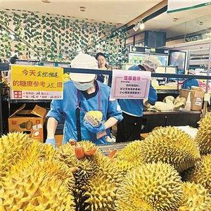 位于天河城的大型商超永旺,榴莲货架占据超市入口C位,价格23.9元-39.9元每斤不等。工作人员告诉记者,相比4月份榴莲上市初期,每斤便宜了三五元。现场多位正在购买的市民表示,目前价格可以接受。有年轻人说,是被超市榴莲专属的“一条龙服务”吸引而购买,“有专门的榴莲打秤处,有甜度提醒,也有榴莲挑选贴士,有安全事项提醒,还有几位专职工作人员帮忙挑选和开果。让人感觉买得放心。”