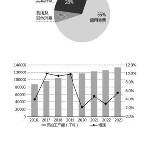 需求端方面,疫情后消费未能如预期强势,需求端不振是拖累玉米市场的重要因素,下游承接不足加剧了玉米市场的供应压力。据了解,我国玉米消费主要包括饲用消费、工业消费、食用及其他消费。其中,饲用消费与工业消费为主要消费方向,占比近93%。在玉米价格连续下跌的行情中,饲料消费需求减弱,深加工企业按需采购,市场收购主体整体心态趋于谨慎。
