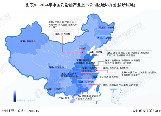 润滑油产业链上的上市企业遍布全国多个省份,其中主要集中山东省和华东地区,润滑油上市企业分别分布在江苏省和山东省。山东省润滑油上市企业有康普顿,江苏省润滑油上市企业有龙蟠科技和中晟高科。
