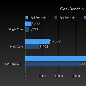 由于GeekBench 6还没有完全适配iPad Pro M4,因此在CPU一栏中显示的还只是「ARM」,不过在另一个界面我们依旧能看到M4的CPU主频给到了4.4GHz,和M1时代的3.2GHz提升可谓巨大。M4 SC、MC、GPU(Metal)得分分别为3653、14532、53433分。作为参考,iPad Pro M1的得分分别为2293、8405、33086分,提升可谓巨大。