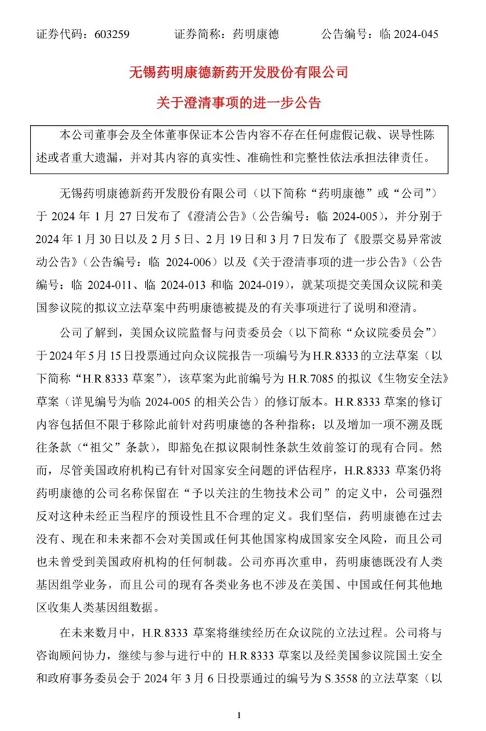 公告还强调,药明康德既没有人类基因组学业务,而且公司的现有各类业务也不涉及在美国、中国或任何其他地区收集人类基因组数据。