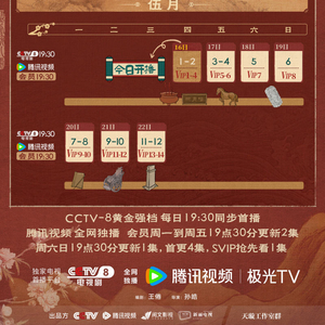 新京报讯 5月16日,电视剧《庆余年2》发布首周追剧日历。该剧将于今日(5月16日)19:30在央视八套(CCTV-8)和腾讯视频播出。其中,CCTV-8黄金强档每日19:30同步首播;腾讯视频全网独播,会员周一到周五19:30更新2集,周六日19:30更新1集,首更4集,SVIP抢先看1集。