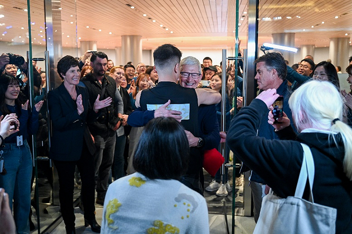 3月21日晚上7点,随着人群中发出的倒数计时,苹果上海静安店正式开业。苹果CEO库克和身穿蓝色T恤的员工们一起,拉开了新店的弧形玻璃门,用拥抱欢迎中国顾客。