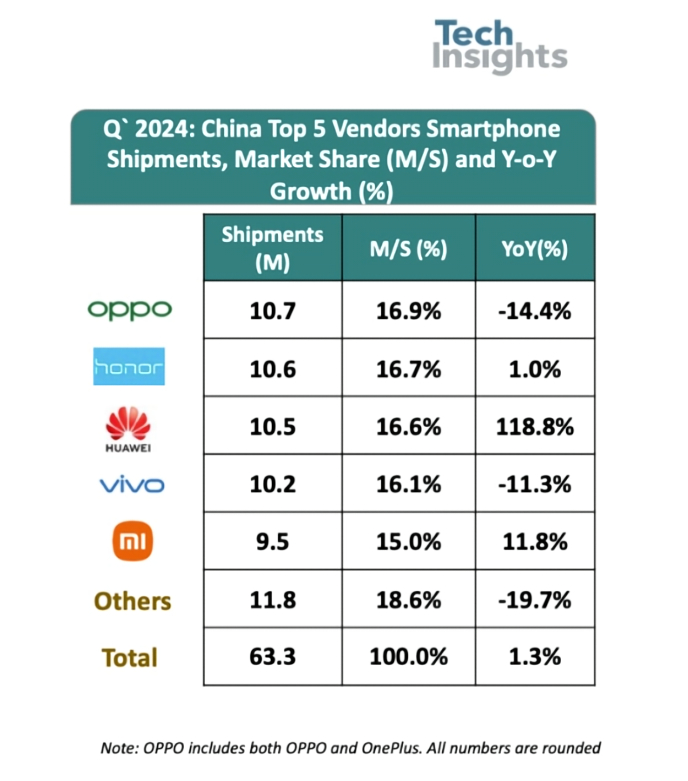 据全球行业分析公司Counterpoint Research和TechInsights的研报显示,2024年一季度,iPhone在中国的销量下降近20%,在国内手机市场占有率的厂商排名中,中国品牌包揽前五名,依次是:OPPO、荣耀、华为、vivo和小米。