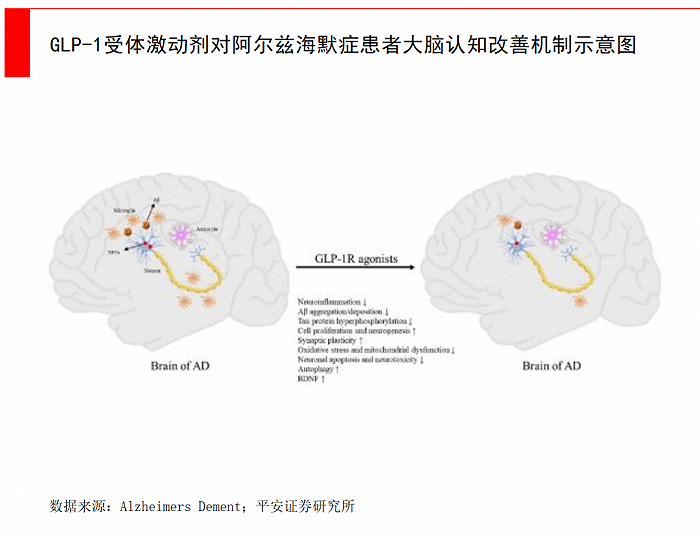 阿尔兹海默症也被称为“3型糖尿病”,其危险因素主要包括糖尿病、胰岛素抵抗、衰老。在既往研究中发现,阿尔兹海默症患者存在脑胰岛素抵抗,可能与AD的认知减退有关。临床初步表明GLP-1R有保护AD患者认知功能,GLP-1R激动剂或通过神经保护作用,改善认知及记忆。