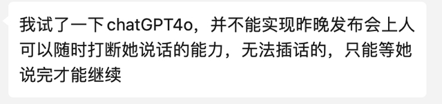 当然也有评论说:发布会就是样板间,实际使用不可能这么丝滑。确实,有一些已经试用的网友说了:目前还不能实现发布会上可以随时打断它说话的功能。所以GPT-4o至少在当下版本还是一个“话唠”,再加一个“麦霸”。