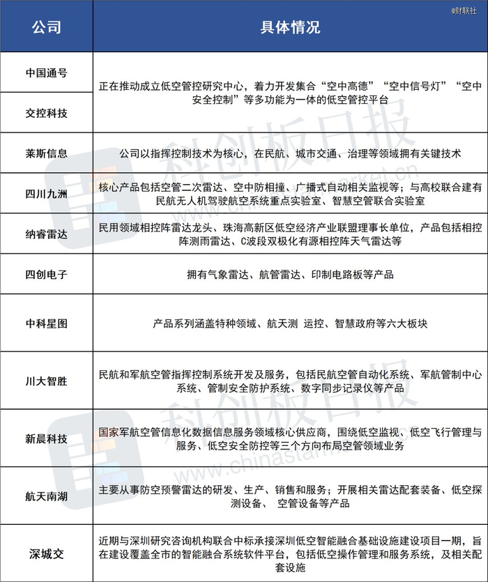 值得一提的是,中国通号、交控科技之前主要业务聚焦于铁路列车运行领域,分别主营轨道交通控制系统与信号系统。目前,这两家公司正在推动成立低空管控研究中心,着力开发集合“空中高德”“空中信号灯”“空中安全控制”等多功能为一体的低空管控平台。