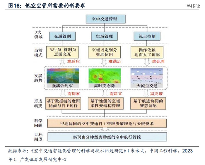 传统民航空管模式下,人工操作在空管系统中占比较大,新型低空空管则需要引入大量先进技术。广发证券5月10日报告也指出,通信、导航、监视与空中交通管理系统是传统民航空中交通管理的核心,低空背景下,无人化、精细化、智能化是新一代空管的重要特征。