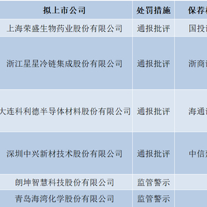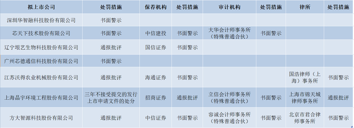 深交所方面,则有7家拟IPO企业因违规被罚。其中,深圳华智融科技股份有限公司、芯天下技术股份有限公司、广州芯德通信科技股份有限公司被采取书面警示的自律监管措施;辽宁垠艺生物科技股份有限公司、江苏沃得农业机械股份有限公司、方大智源科技股份有限公司被通报批评。