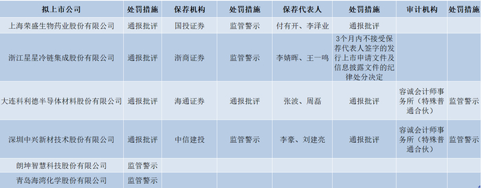 中介机构方面,保荐机构中信建投、国信证券、海通证券、中信证券被书面警示,保荐晶宇环境的招商证券被通报批评。
