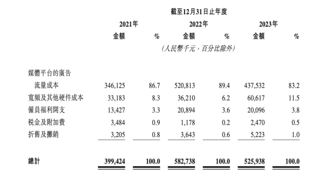 对此,迈富时在招股书中表示,媒体平台的广告流量成本由2021年的人 民币346.1百万元增加至2022年的人民币520.8百万元。此大致与在线广告解决方案服务的业务增长相符。我们的媒体平台广告流量成本由2022年的人民币520.8百万元减少至2023年的人民币437.5百万元,与在线广告解决方案服务的收入减少一致。
