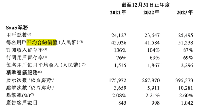 SaaS业务的盈利本质是向订阅用户收取订阅费用,报告期内,迈富时Saas用户总数为24127、23647、25496,SaaS业务的每名用户平均合约价值分别为人民币45026元、41584元和51238元。无论是用户数量的提升还是每名用户平均合约价值的提升都对营收的提升起到了积极的影响。