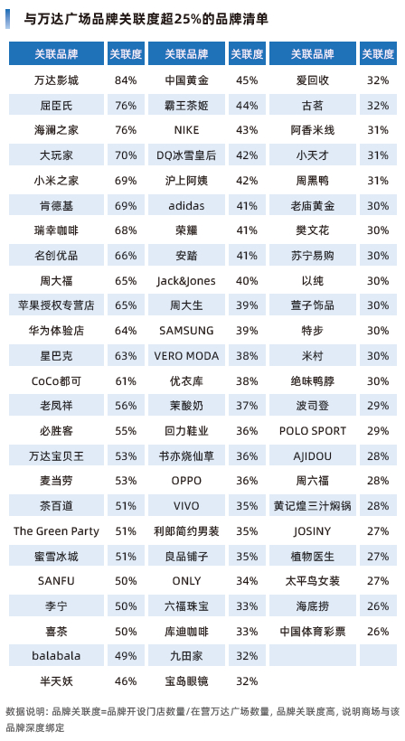随着万达广场数量增加,其关联品牌数量也走出了增长之路。据赢商研究中心监测,与万达广场品牌关联度(品牌关联度=品牌开设门店数量/ 在营万达广场数量)超过25%的品牌共73 个,在60% 以上的品牌共13个。