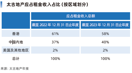 2023年太古地产应占租金收入构成来看,虽然香港仍是绝对主力,但中国内地的比例有所提升,成为公司收益增长的主要来源之一。