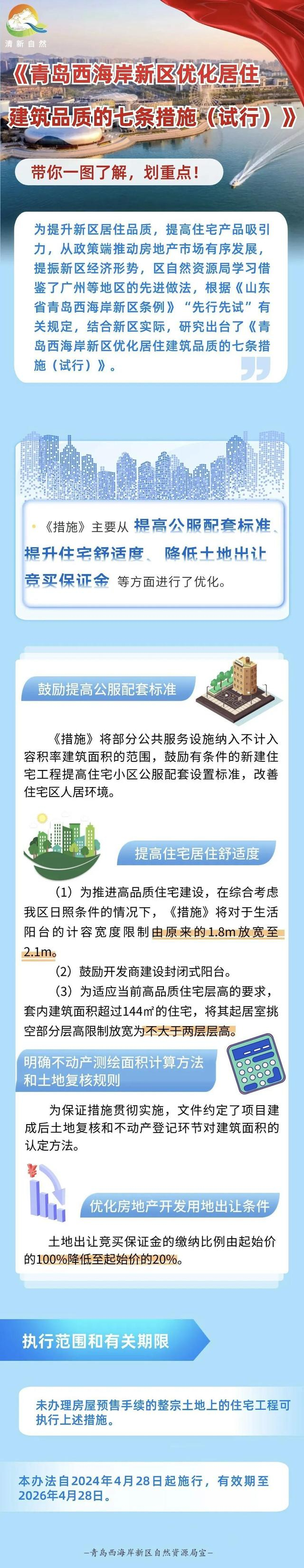 《青岛西海岸新区优化居住建筑品质的七条措施(试行)》主要从提高公服配套标准、提升住宅舒适度、完善房地产开发用地出让条件等方面进行了优化升级。