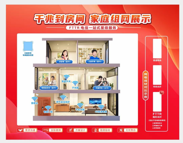 五是好服务:专业的电信智慧家庭工程师上门服务,一户一案,个性化定制方案,设计安装调测一站式服务;
