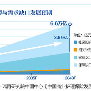 中国城镇地区老年人长期护理费用需求持续上升,预计从2021年的1.4万亿元逐步上升至2030年的3.1万亿元,到2040年达到6.6万亿元;护理费用保障缺口规模亦将随之持续扩大,预计从2021年的9217亿元增长到2040年的3.8万亿元,20年间将扩大3倍。
