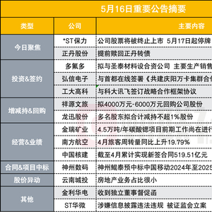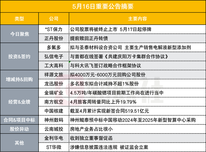 *ST保力公告,截至2024年5月16日,公司股票收盘价连续二十个交易日低于1元,已触及交易类强制退市情形,公司股票将被深圳证券交易所终止上市交易。公司股票将自5月17日(周五)开市起停牌。