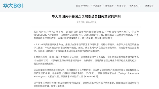 5月16日傍晚,华大集团发布了声明进行回应,认为H.R.8333在该委员会的通过,并不意味着将最终成为法律,后续可能被修改或终止。