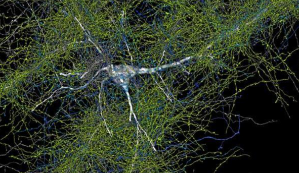 单个人类神经元(白色)和连接到它的其他神经元的所有轴突,蓝色线是抑制性轴突、绿色线是兴奋性轴突