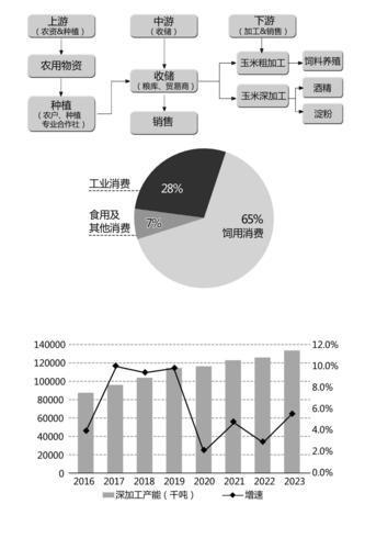 目前我国玉米全产业链主要涉及四大类主体,包括农资经销商、农户和种植专业合作社、玉米收储企业与玉米加工企业。产业链上游为种植环节,农户和种植专业合作社从农资经销商处获得相应农用物资进行耕种;产业链中游为收储环节,玉米通过粮食收储企业的流通,传递至加工企业;产业链下游为加工环节,由加工企业对玉米进行加工,再销售产成品。