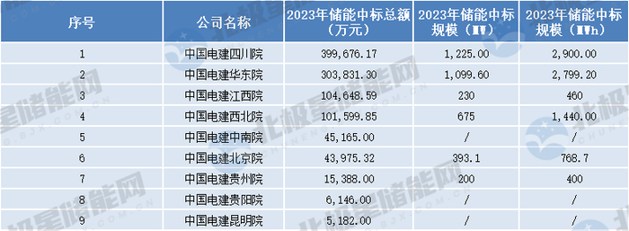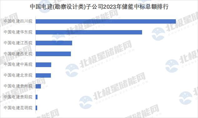 2023年,中国电建储能中标总额排前九的子公司为:中国电建四川院、中国电建华东院、中国电建江西院、中国电建西北院、中国电建中南院、中国电建北京院、中国电建贵州院、中国电建贵阳院、中国电建昆明院。