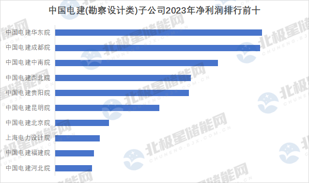 年度净利润额方面,2023年排名前十的子公司为:中国电建华东院、中国电建成都院、中国电建中南院、中国电建西北院、中国电建贵阳院、中国电建昆明院、中国电建北京院、上海电力设计院、中国电建福建院、中国电建河北院。