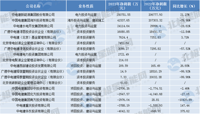 中国电建(投资类)子公司2023年发展情况对比统计表