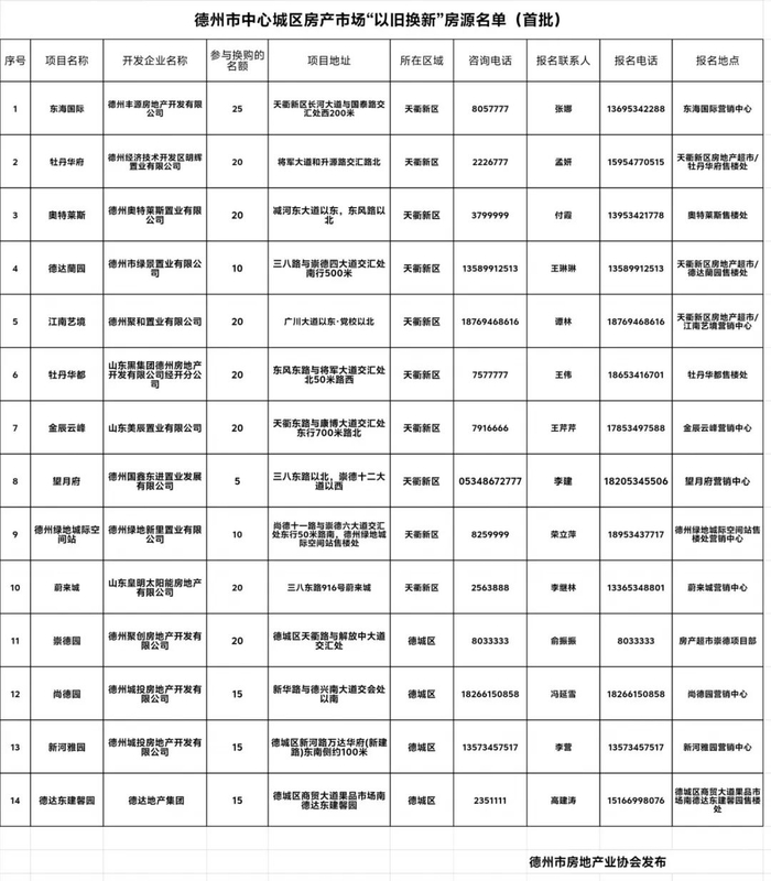 (一)房源发布。参与“以旧换新”活动的房地产开发企业和房源信息,由德州市房地产业协会通过德城区和天衢新区房产超市分批面向社会发布,包括楼盘名称、名额、报名方式、时间、地点等。
