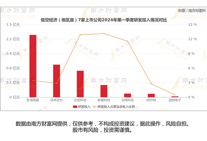 研发投入层面来看,2024年第一季度卧龙电驱研发投入1.28亿元,占公司营业总收入比例3.43%;宗申动力研发投入6706.39万元,占公司营业总收入比例2.88%;交控科技、新晨科技、北纬科技、阿尔特、四创电子2024年第一季度研发投入分别为5450.52万元、2510.84万元、746.46万元、697.2万元、167.09万元,占公司营业总收入比例分别为12.88%、13.12%、11.54%、2.77%、0.49%。