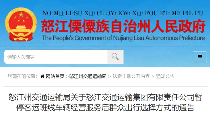 您好!怒江交通运输集团有限责任公司已于2023年8月31日进入破产清算程序,根据破产工作进度和现实需要,将于2024年6月1日起暂停客运班线车辆营运。为持续满足人民群众出行需求,现将全州客运出行保障方式作如下通告。今后,我们将积极引导、鼓励道路运输经营企业申请新的客运站经营,持续发展班线客运、定制客运等,为群众出行提供优质运输服务。