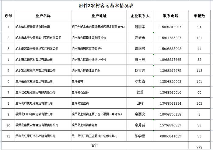 全州目前有农村客运企业11家,客运车辆773辆。其中,泸水市:泸水信达短途客运有限公司94辆、泸水市古登乡天胜农村客运有限公司121辆、泸水老窝镇顺安短途客运有限公司11辆、泸水市运捷农村客运有限公司32辆、泸水发达短途汽车客运有限公司113辆;兰坪县:兰坪县通发短途客运有限公司161辆、兰坪佳程短途客运有限责任公司65辆、兰坪县辉腾短途客运有限公司102辆;福贡县:福贡县口口道路运输有限公司1辆、福贡县富民农村客运有限责任公司38辆;贡山县:贡山县红绿灯汽车出租有限公司(农村客运)35辆。