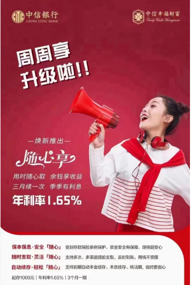 中信银行公告2023年5月15日起下架暂停薪金煲周周享,但马上新的“升级”产品介绍已经出现,据产品介绍,焕新推出的随心享为三个月一期,支持到期本金续存、本息续存,年化利率为1.65%。