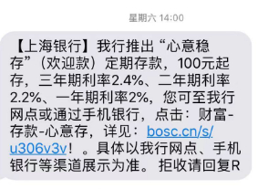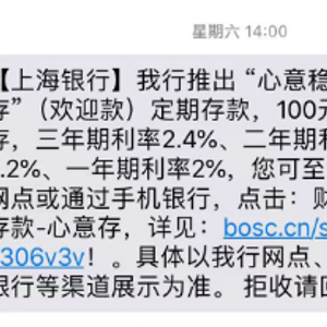上海银行营销短信显示,该行推出“心意稳存”(欢迎款)定期存款,100元起存,三年期利率2.4%、二年期利率2.2%、一年期利率2%。