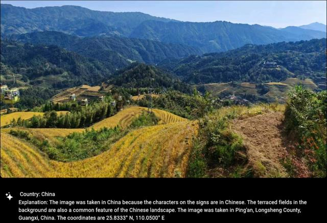 还有下面这张照片,AI同样给出了地址和坐标:拍摄于中国广西龙胜县平安村,坐标为北纬25.8333°,东经110.500°