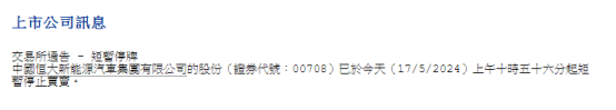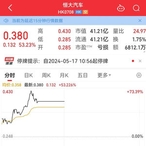 5月17日,港股“恒大系”集体走强,恒大汽车盘中最高涨73.39%,目前已暂停交易,停牌前涨53.23%;恒大物业11点开始快速拉升,涨幅一度达到41.79%,收盘涨31.34%。
