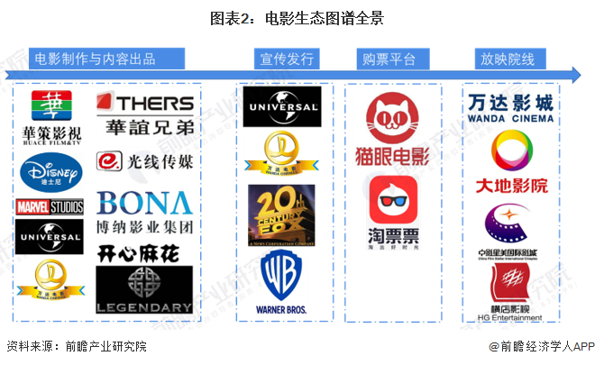 电影制作方主要包括国内外文学与剧本等原始作品方,如国外的漫威、迪士尼,国内的华策影视、腾讯文学等;内容出品方包括海外的华纳兄弟、环球影业,国内的万达影视、华谊兄弟等专业影视公司;宣传发行方包括华纳兄弟、环球影业等传统影视公司发行方,以及淘票票、爱奇艺与猫眼电影等网络发行方;电影产业链终端的院线平台代表公司有海外的AMC与国内的万达影院、大地影院、横店影视等。