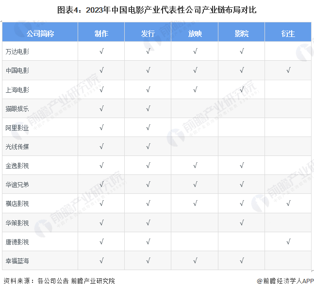 目前,中国电影、横店影视的产业链布局较为完善,涉及制作、发行、放映、影院、衍生全环节;其次,万达电影、上海电影、金逸影视、华谊兄弟、幸福蓝海的布局也较为完备。