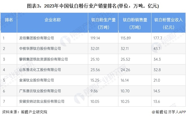 根据各家钛白粉上市公司披露的钛白粉生产及销售量情况分析。2023年龙佰集团的钛白粉生产及销售量最高,2023年该集团产销量为分别为119.14万吨和115.89万吨。从钛白粉业务的营业收入情况来看,龙佰集团钛白粉业务收入超过150亿元,排名第一;中核钛白为43.1亿元,排名第二。