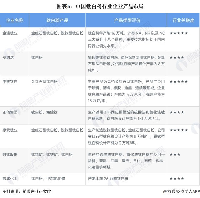 行业主要上市公司:金浦钛业(000545);安纳达(002136);中核钛白(002145);龙佰集团(002601);惠云钛业(300891);鲁北化工(600727)等。