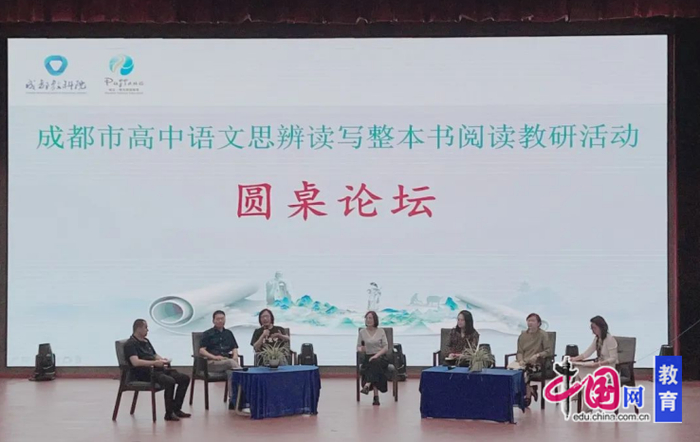 邛崃市高中语文教研员赵前华主持圆桌论坛。余党绪、成都市教育科学研究院高中语文教研员罗晓晖、成都市武侯区高中语文教研员杨孜、成都市高新区高中语文教研员冯小琼、蒲江县高中语文教研员李纪围坐在一起,就区域内整本书阅读教学策略进行分享与交流,碰撞出整本书阅读教学的灵感火花,点燃整本书阅读教学的育人智慧。