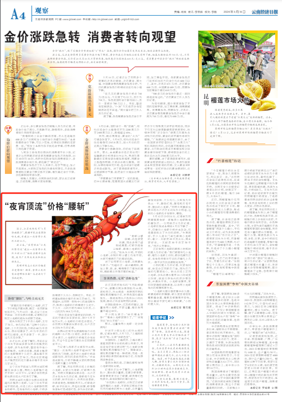 “现在还没有到最便宜的时候,今年的行情比往年要差些,预计5月下旬到6月,小龙虾的价格还会更低。”在昆明大观篆新农贸市场,水产店店主刘先生告诉记者。